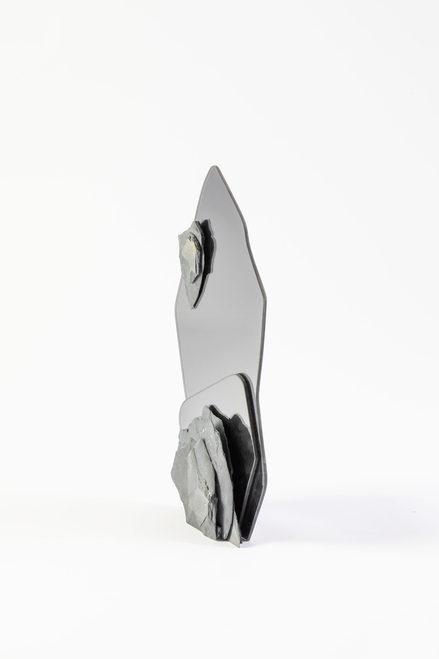 A sculptural mirror that fuses raw material with refined form, this piece features a base and body carved from layered natural slate, echoing geological formations. Its smoked mirror surface rises in a jagged, asymmetrical silhouette, blending perfectly with the rugged stone.