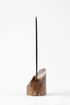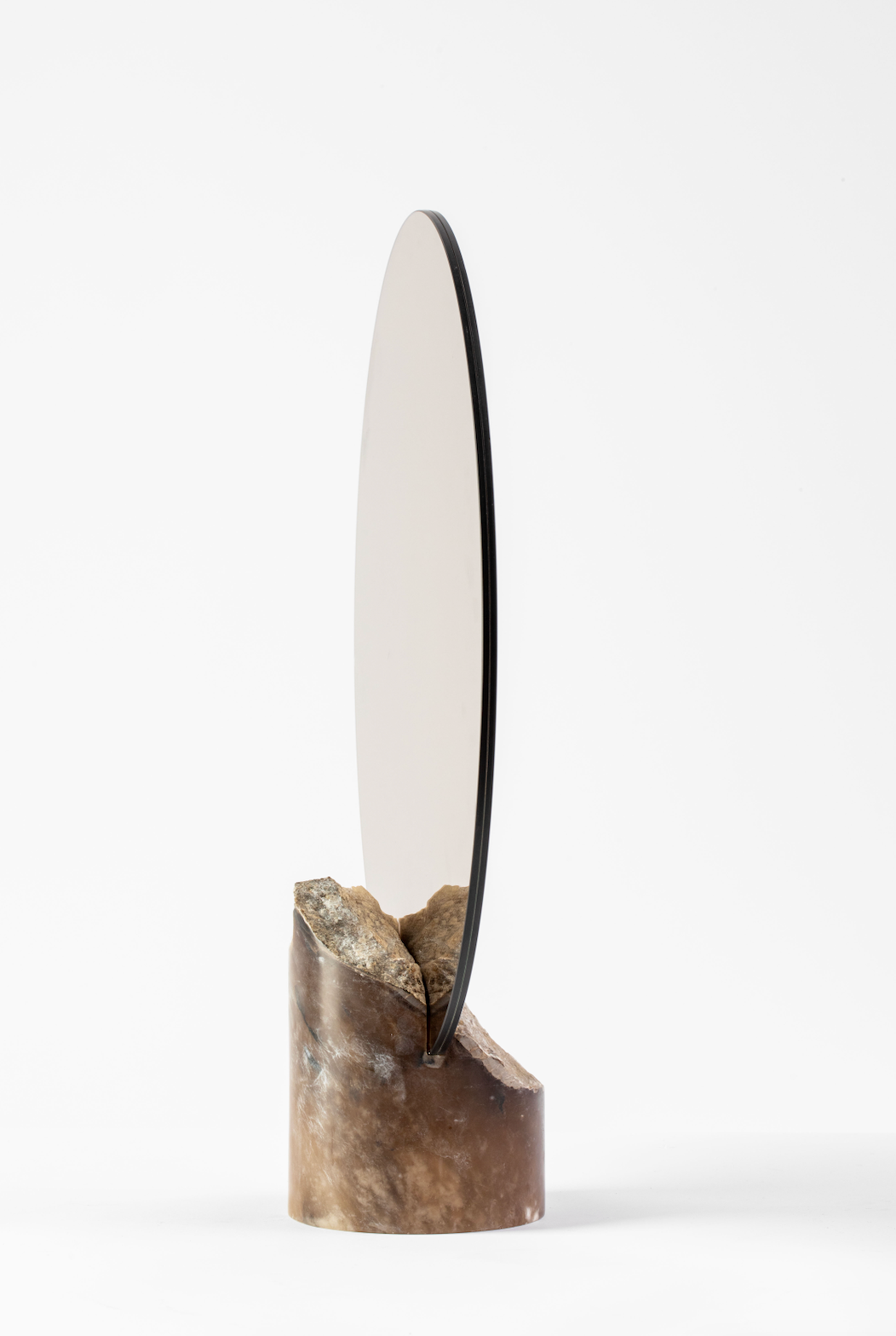 The result is an object that balances opposites: organic and geometric, earthy and refined. The mirror rises like a disc of light from the stone, forming a striking vertical composition that evokes both sculpture and serenity.